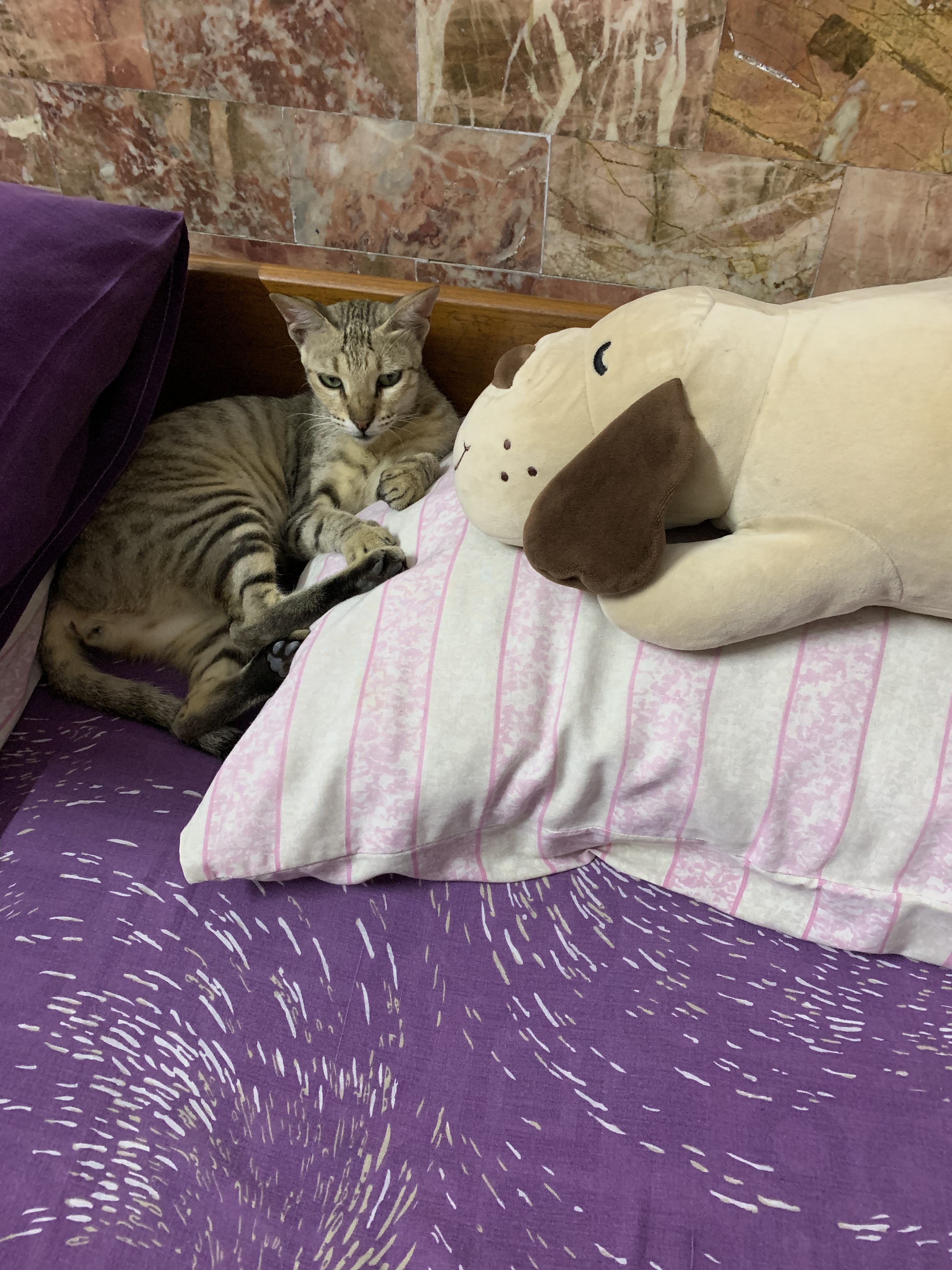 I am here to share with you another picture of Tiny resting peacefully in between my pillows and my stuff toy!