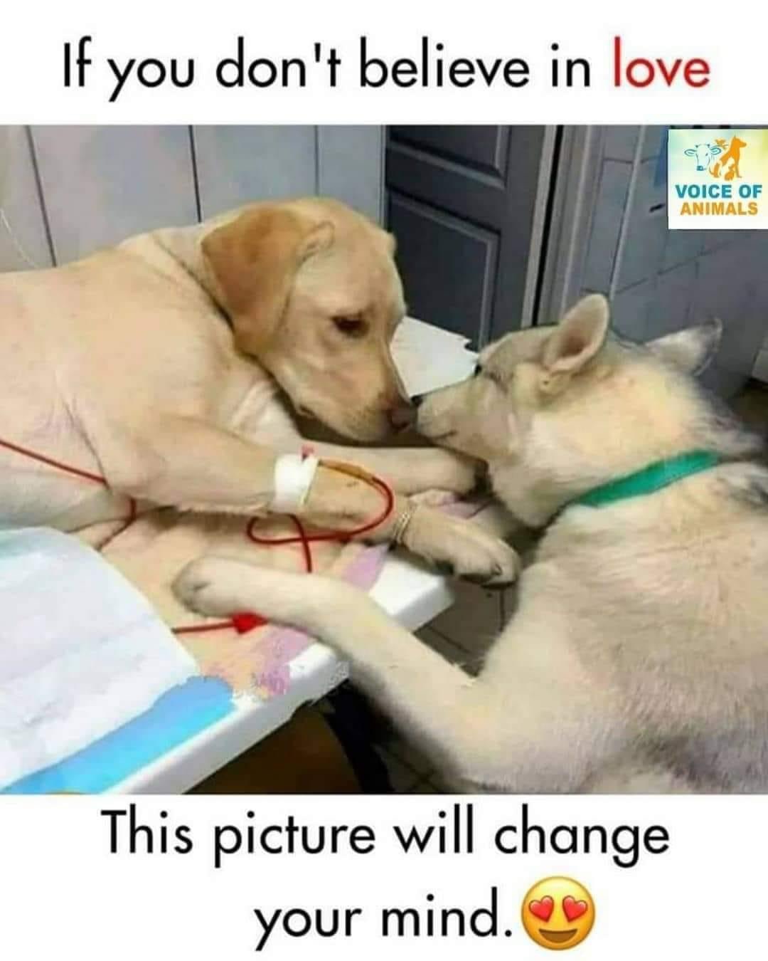 This image shows the true bonding of Dogs, yes of two different breeds but just look at their bonding. The labrador retriever is on IV and the Husky is his best friend, they grew up together forming a lasting friendship and this image perfectly states an example of how these animals can feel and sense pain. This husky wanted to be with his Labrador friend, so he was brought in the clinic and comforted his friend that it’s going to be okay.