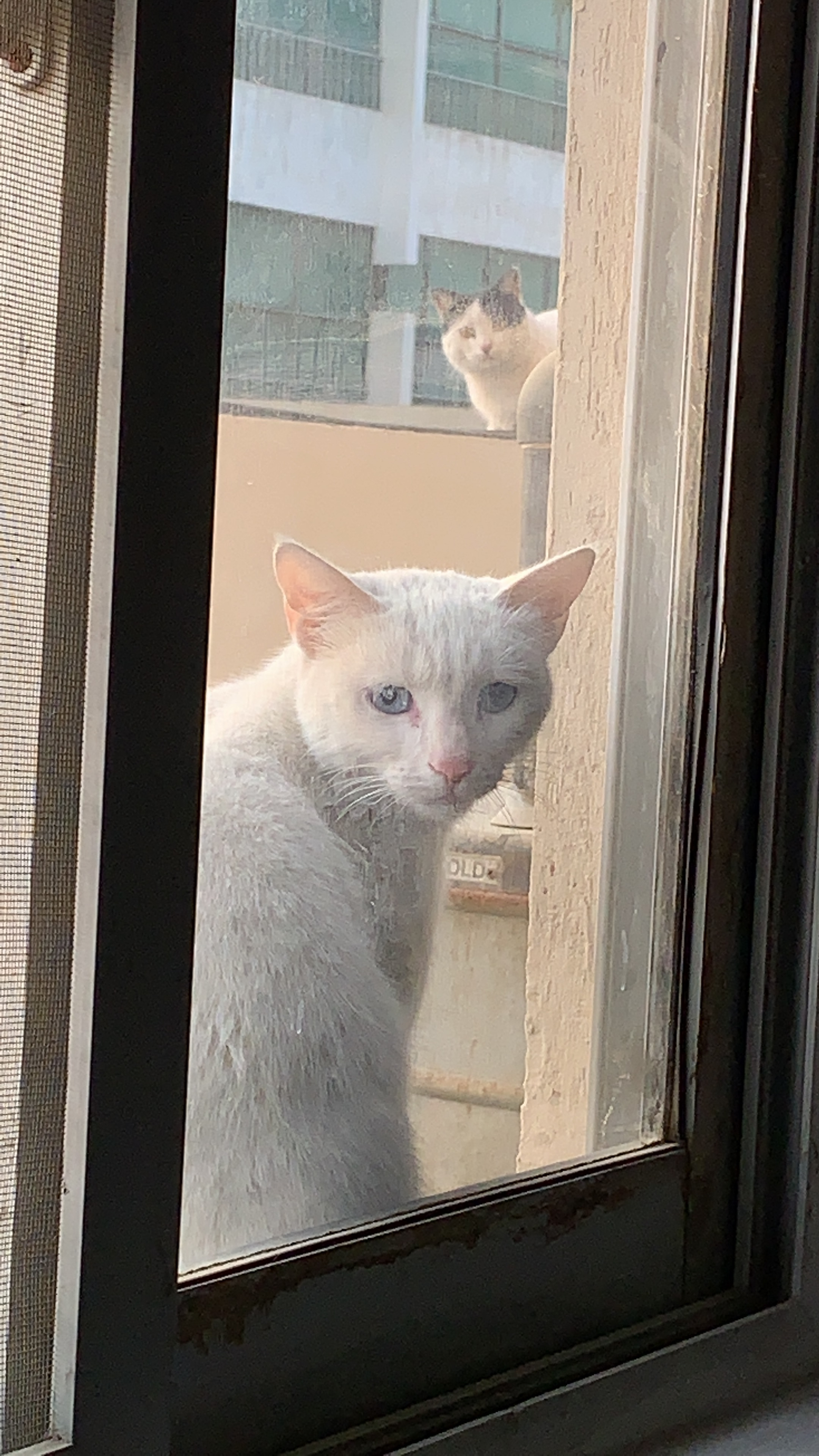 The cats that you see in the image, the one sitting on the window sill is Snowy and the one sitting on the wall is another new stray who visits me often for food. The jealousy factor is between snowy and the other cats as she feels insecure that the other cats might get close to me.