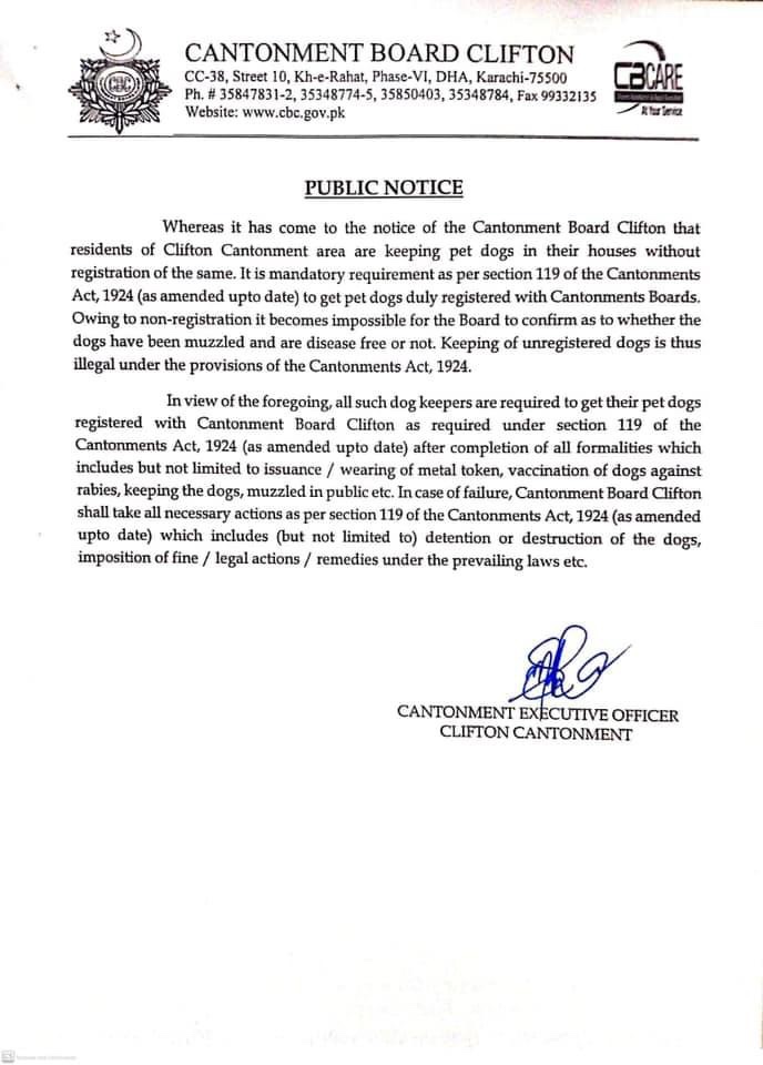 This is a notice forwarded to all by the Authority of Defence and Clifton to get their Pet Dogs registered so that the unidentified dogs could be dealt with whatever manner they wish.
