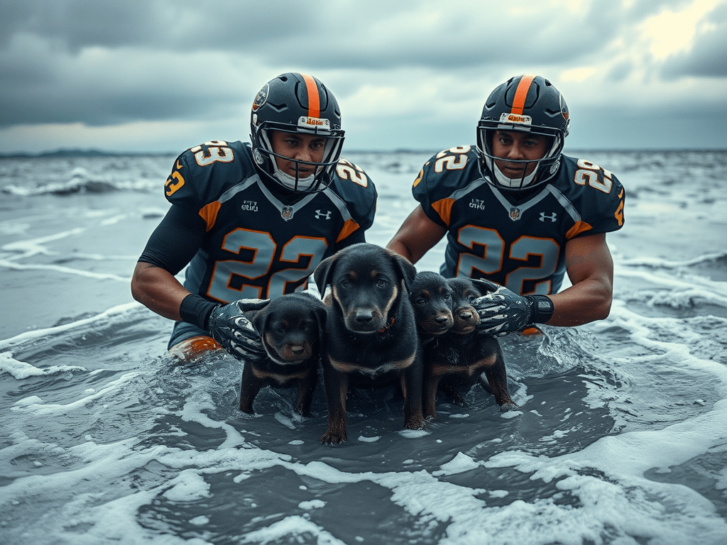 Two professional football players embark on a trek through freezing water. They aim to save a mother dog and her puppies. The animals were left stranded during a storm evacuation. See what unfolds when they finally bring the little family back to their warm truck!